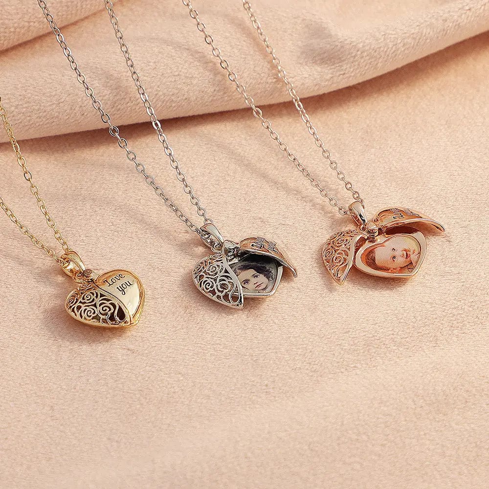 Introducing our Custom Heart Hollow Hidden Photo Necklace. a timeless piece that allows you to carry cherished memories close to your heart.